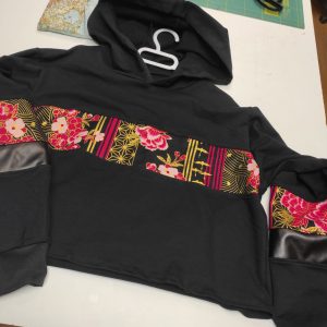 Sudadera cortita hecha con felpa sin perchar (sudadera de entretiempo) combinada con estampado algodon Peonies on Black y línea de polipiel elástica en las mangas.